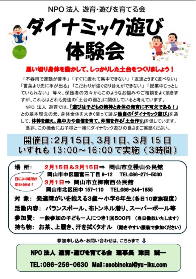 NPO法人遊育・遊びを育てる会では2月15日、3月1日、3月15日にわたってダイナミック遊び体験会を開きます。