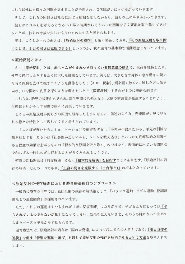 以上、今回は遊育の基本理念である、「対症療法的手法より土台作り」という考え方の背景を中心にご説明いたしました。次回は遊育療法の中核をなす「ダイナミック遊び」の内容や具体的な方法、効用等についてご説明させていただきたいと思います。